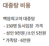 대중탕 비용에 대한 안내입니다. 백암온천의 대중탕은 최대 150명이 동시에 입장할 수 있을 정도로 매우 넓은 규모를 자랑하며, 성인 1명은 9천원, 소인은 5천원입니다.