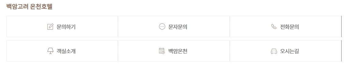 이 화면은 백암 고려 온천호텔의 하단 메뉴 구성입니다. 이용객들이 궁금해할 수 있는 여러 항목들을 한눈에 볼 수 있도록 정리되어 있습니다. 문의를 원하신다면 ‘문의하기’, ‘문자문의’, ‘전화문의’ 메뉴를 통해 바로 연락할 수 있고, 온천 정보는 ‘백암온천’ 메뉴에서 확인 가능합니다.