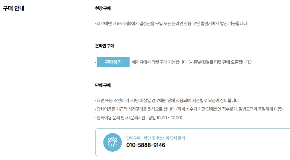 또한, 단체 구매는 대인 또는 소인 각각 20명 이상일 때 적용되며, 사전 예약이 필수입니다. 성수기에는 일반 고객과 동일하게 이용되며, 별도 단체 할인은 제공되지 않을 수 있습니다. 문의는 평일 오전 10시부터 오후 5시까지 전용 번호로 하면 됩니다.