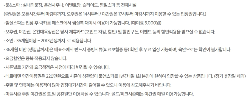 단, 오후권, 야간권, 온천 대욕장권은 할인 대상에서 제외되며, 삼성페이와 엘지페이를 제외한 모바일 카드 사용은 불가합니다.