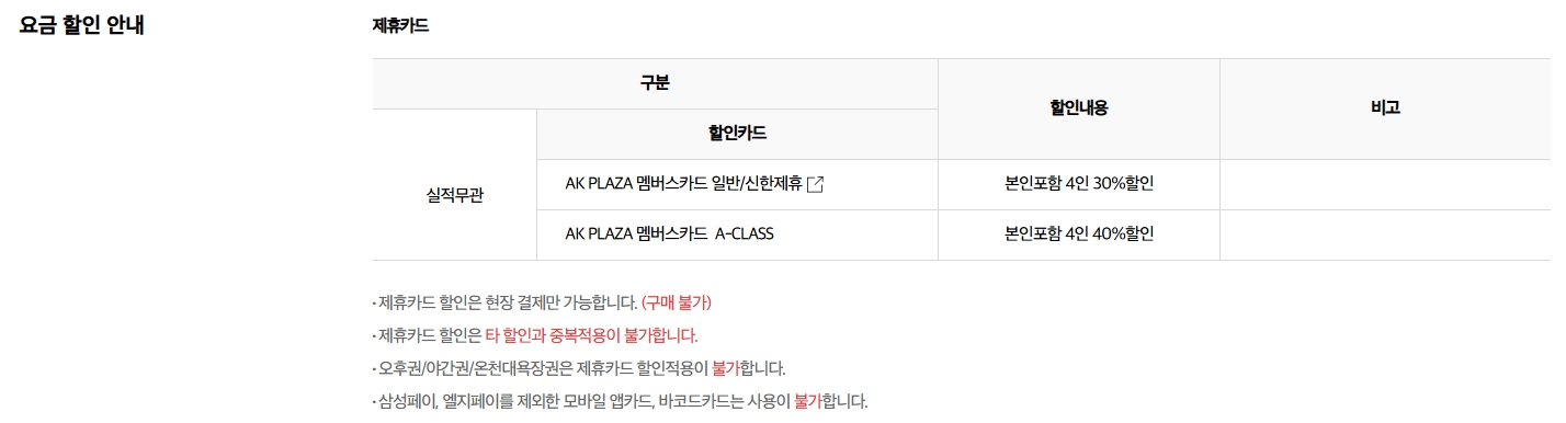 제휴카드 할인은 현장 결제 시에만 가능하며, 온라인 구매 시에는 적용되지 않습니다. AK PLAZA 멤버스카드 이용 시 일반카드와 신한제휴카드는 4인 기준 30% 할인, A-CLASS 카드는 4인 40% 할인이 적용됩니다.