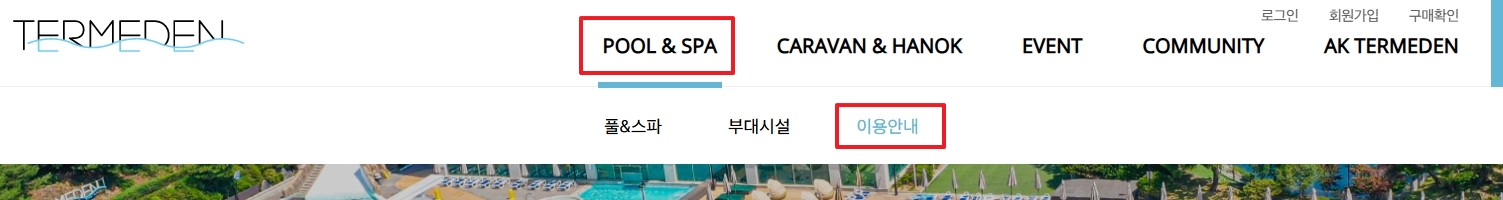테르메덴 홈페이지에서 풀&스파(Pool & Spa) 메뉴를 선택한 뒤, 하위 메뉴 중 이용안내를 클릭하면 입장권 구매, 요금 안내, 할인 정보 등 상세한 정보를 확인할 수 있습니다.