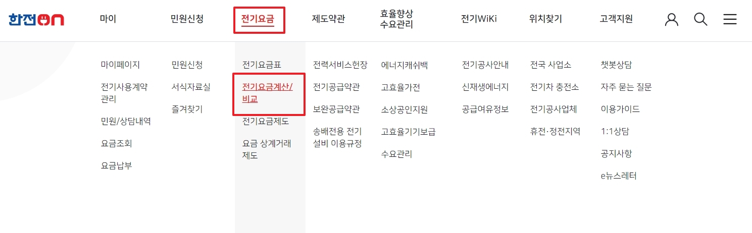 3. 한전on 페이지에 들어가면 메뉴가 꽤 다양하게 나뉘어 있어요. 상단 메뉴 중에서 ‘전기요금’을 클릭한 다음, 하위 메뉴에 있는 ‘요금계산/비교’를 눌러주세요. 여기서 내 사용량에 맞춘 예상 요금을 확인할 수 있게 됩니다.