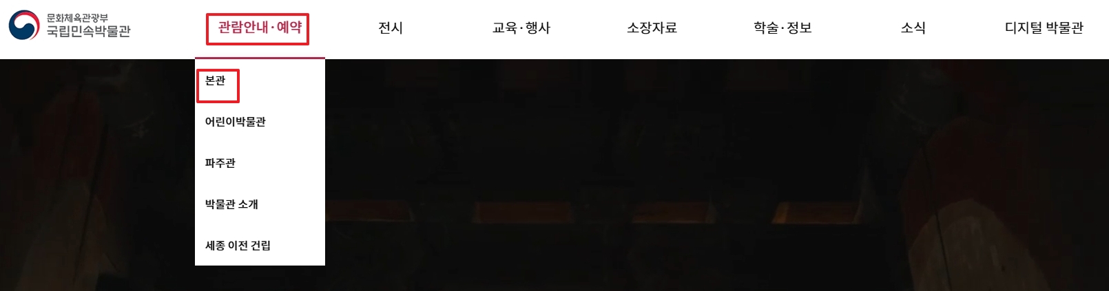 국립민속박물관 홈페이지 상단 메뉴를 보면, 관람객들이 가장 자주 찾는 정보인 관람안내·예약 항목이 눈에 띄게 표시되어 있습니다. 해당 항목을 클릭하면 다양한 하위 메뉴가 펼쳐지는데, 여기서는 '본관', '어린이박물관', '파주관', '박물관 소개', '세종 이전 건립' 등의 상세 분류로 나뉘어 있어 각 시설에 대한 정보를 쉽게 찾을 수 있도록 구성되어 있습니다. 특히 본관 메뉴는 가장 먼저 보여지는 위치에 있어, 국립민속박물관의 주 전시공간을 관람하고자 하는 분들이 직관적으로 접근할 수 있습니다. 이런 구조는 관람객의 편의를 고려한 메뉴 배치라고 할 수 있습니다.