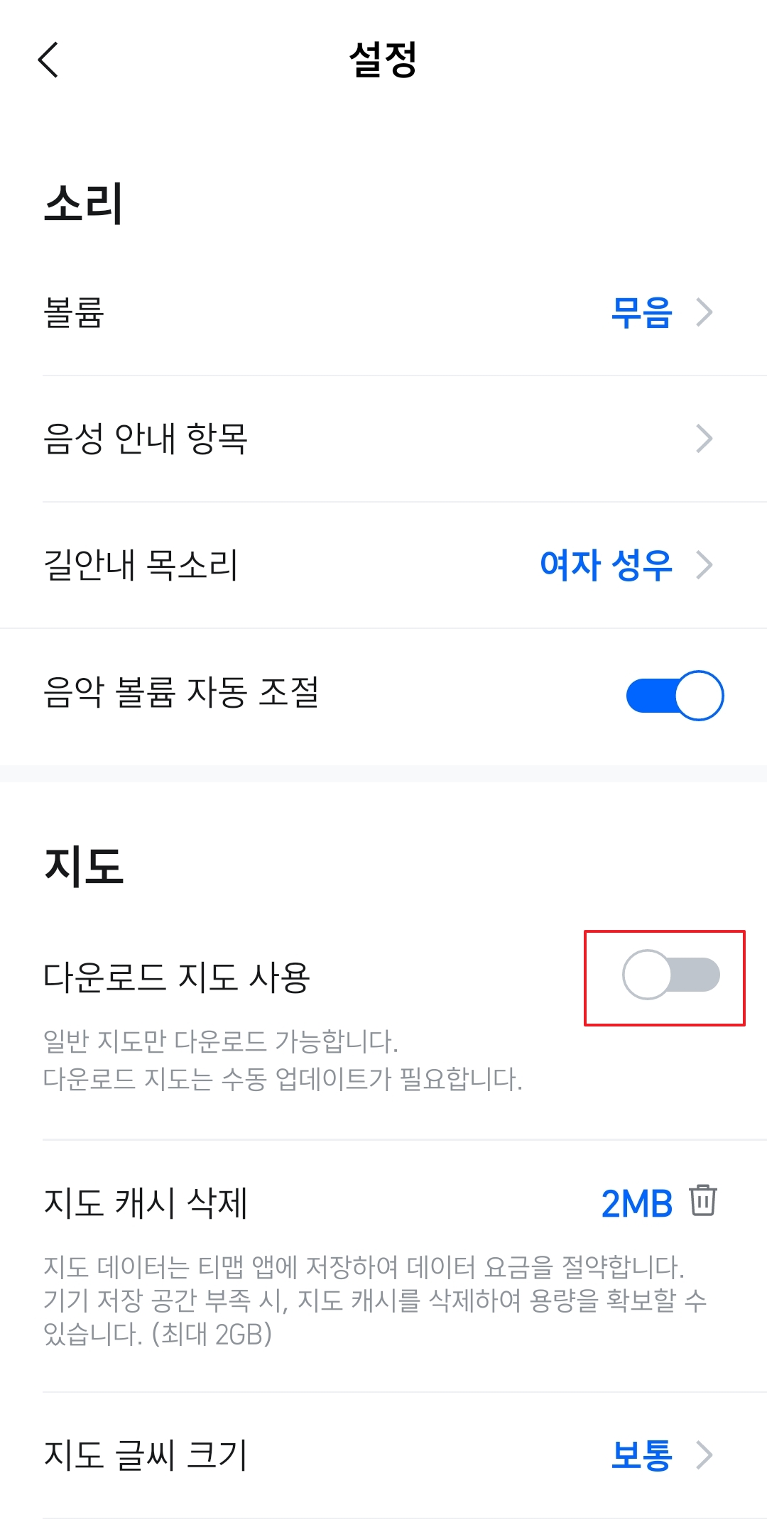 4. 설정 화면으로 들어가셨다면 이제 지도 항목을 찾아주세요. 그 안에 다운로드 지도 사용이라는 옵션이 있는데요, 이 옆에 있는 스위치를 눌러 활성화시켜야 지도를 저장할 수 있습니다. 평소 데이터 절약에도 도움이 되는 기능이에요.