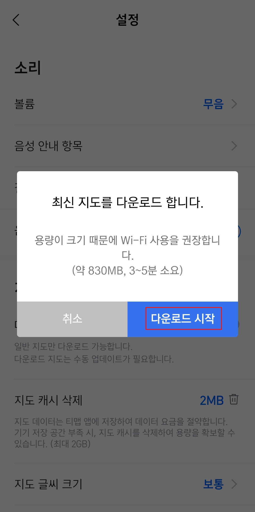 5. 스위치를 누르면 최신 지도를 다운로드하겠냐는 팝업이 뜹니다. 여기서 확인을 누르면 다운로드가 시작되는데요, 용량이 약 830MB 정도라 와이파이 연결 상태에서 진행하는 걸 추천드립니다. 용량이 크니 저장공간도 미리 체크해보세요!