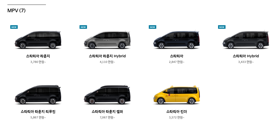 7. MPV(다목적 차량) 카테고리에서는 스타리아 시리즈가 있는데요, 넓은 실내 공간과 다양한 좌석 배열이 가능해서 대가족이나 비즈니스용 차량 찾으시는 분들께 인기가 많습니다.