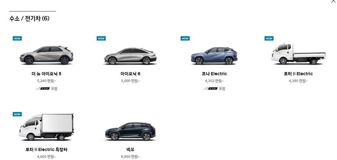 3. 친환경차 메뉴에서는 전기차와 수소차가 따로 정리되어 있어서 찾기 정말 쉬워요. 아이오닉 5, 아이오닉 6 같은 인기 모델뿐만 아니라 포터 II Electric처럼 상용 전기차도 함께 소개돼서 다양한 니즈를 충족시켜줍니다.