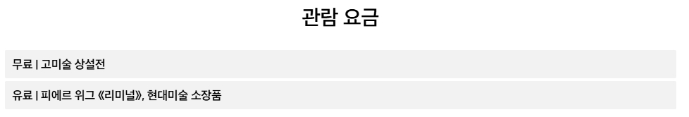 관람 요금은 전시 내용에 따라 다릅니다. 고미술 상설전은 무료로 누구나 자유롭게 관람할 수 있습니다. 반면 현대미술 소장품 및 피에르 위그 전시는 유료이며, 별도의 입장료를 지불해야 합니다. 전시 관람 계획 시 어떤 전시가 포함되어 있는지 확인하는 것이 중요합니다.