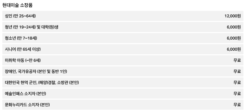 현대미술 소장품 전시의 입장 요금은 성인 기준 12,000원이며, 청년 및 대학생, 청소년, 시니어는 6,000원입니다. 이외의 대상자들 역시 무료 입장이 가능하므로 관람 시 필요한 신분증이나 증빙자료를 지참하는 것이 좋습니다. 현대미술 작품을 중심으로 다양하고 감각적인 전시가 구성되어 있는 만큼, 감성적인 경험을 원하는 분들께 알맞은 전시입니다.