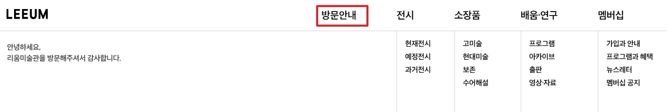 리움미술관의 방문안내 페이지입니다. 상단 메뉴에는 전시, 소장품, 배움·연구, 멤버십 등의 주요 카테고리가 있으며, 관람객이 필요한 정보를 쉽게 찾을 수 있도록 구성되어 있습니다. 인사말을 통해 미술관을 방문한 분들에게 감사의 메시지를 전하고 있어 친절한 첫인상을 줍니다. 메뉴 중 ‘방문안내’는 붉은 테두리로 강조되어 있어 관람에 필요한 정보가 이곳에 있음을 쉽게 알 수 있습니다.
