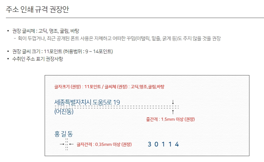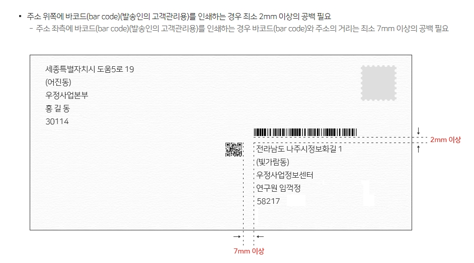 6. 주소를 적을 때는 줄 간격을 1.5mm 이상으로 유지하고, 이름 사이의 간격은 0.35mm 이상 띄워야 가독성이 좋아진답니다. 바코드 인쇄 공간도 따로 확보해야 해서, 위쪽에는 2mm 이상의 빈 공간을 남겨야 해요.