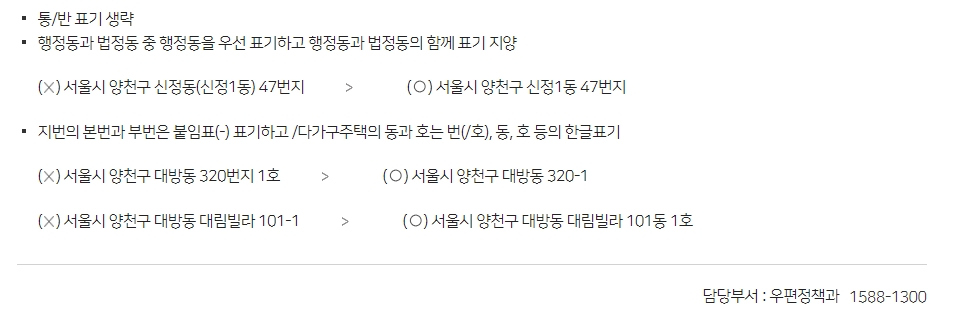 10. 지번주소 작성 시에는 통이나 반을 생략하고, 행정동만 적는 것이 원칙이에요. 본번과 부번 사이는 붙임표(-)로 연결하고, 다가구주택의 경우 동호수는 101동 202호처럼 한글로 표기하는 것이 바람직하다고 하네요.