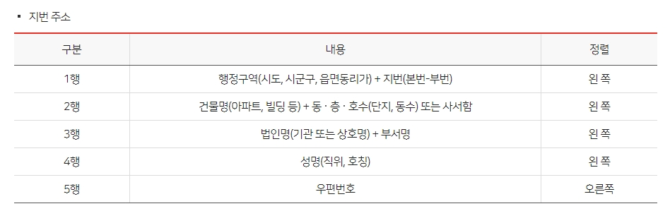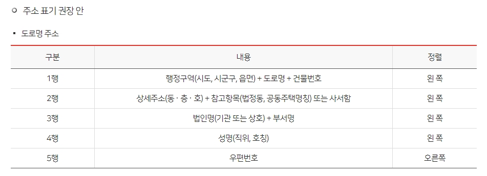 7. 도로명주소를 적을 때는 1행에 시군구명과 도로명, 건물번호를 적고, 2행은 상세주소를 작성합니다. 3행은 기관명이나 부서명, 4행은 받는 사람 이름을 쓰고, 5행에 우편번호를 오른쪽 정렬로 입력해 주세요.