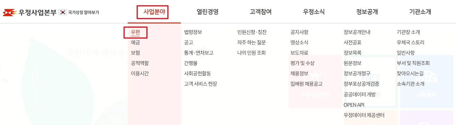 2. 홈페이지 상단에 있는 메뉴 중에서 사업분야를 클릭한 다음, 펼쳐지는 항목 중에서 우편을 찾아 클릭해 주세요. 다양한 우편서비스와 요금 정보, 그리고 규격에 대한 안내를 쉽게 찾아볼 수 있어요.
