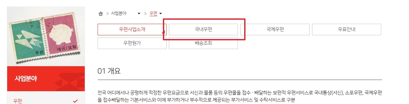 3. 우편 메뉴로 이동하면 새로운 하위 메뉴들이 등장합니다. 여기에서 국내우편 항목을 선택해 주세요. 국내에서 보내는 편지나 소포 등에 관한 자세한 정보들을 볼 수 있습니다.