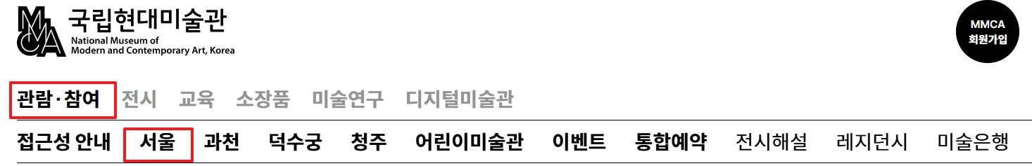 해당 이미지는 국립현대미술관 서울관의 관람 및 참여 메뉴 구성 화면을 보여주는 내용입니다. 상단에는 '관람·참여', '전시', '교육', '소장품' 등의 항목이 있으며, 그 중 ‘관람·참여’와 ‘서울’ 항목이 선택되어 강조되어 있습니다. 이는 국립현대미술관 홈페이지에서 서울관 정보를 찾는 위치를 알려주는 안내 성격의 이미지입니다. 접근성 안내, 과천, 덕수궁, 청주, 어린이미술관, 이벤트, 통합예약 등의 다양한 메뉴도 함께 배치되어 있어서, 방문자가 원하는 정보를 쉽게 찾을 수 있도록 구성되어 있습니다.