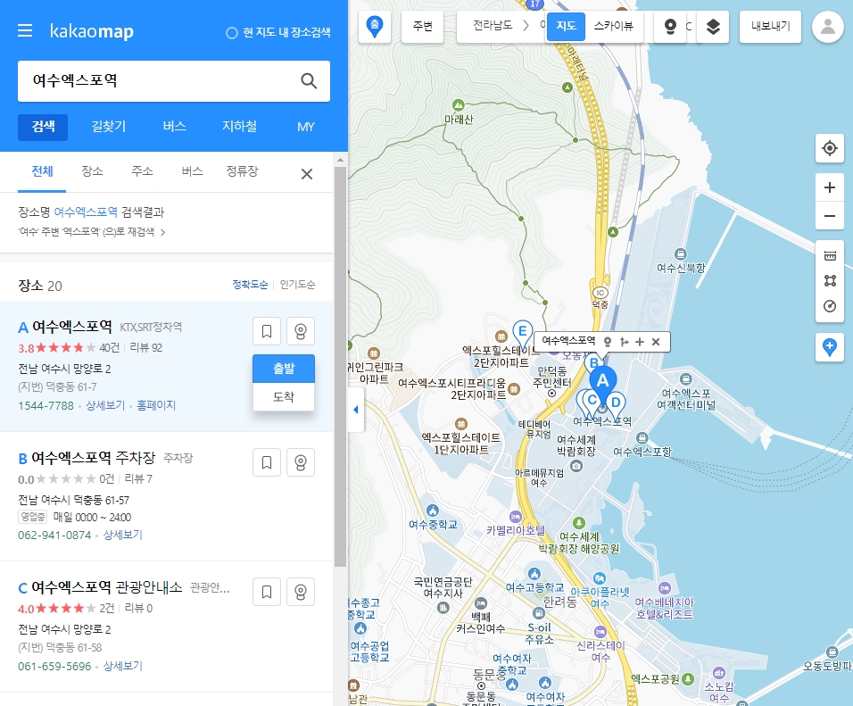 2. 출발지나 도착지 중 하나를 먼저 입력해야 합니다. 저는 출발지부터 설정했는데요, ‘여수엑스포역’을 검색해봤습니다. 이렇게 원하는 장소를 입력하면 지도에 표시되고, 바로 다음 단계로 넘어갈 수 있어요.