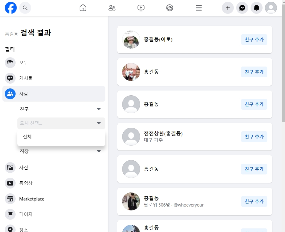 4. 필터 기능을 활용하면 훨씬 편리해요. 친구 여부, 사는 도시, 다녔던 학교, 직장 등 다양한 조건을 추가해서 원하는 사람을 빠르게 찾을 수 있습니다.