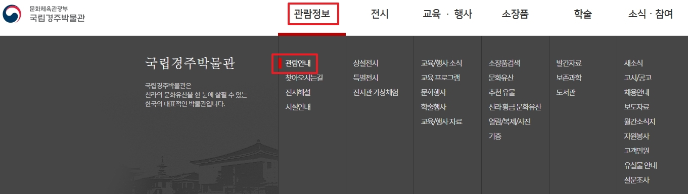국립경주박물관 홈페이지에 접속하면 가장 먼저 상단 메뉴 중 ‘관람정보’라는 항목이 보입니다. 이 메뉴에 마우스를 갖다대면 아래로 펼쳐지는 방식으로 여러 하위 메뉴가 나타나는데, 그 중에서 ‘관람안내’를 클릭하면 관람 시간이나 입장료, 휴관일 등 기본적인 안내가 정리되어 있는 페이지로 이동됩니다.