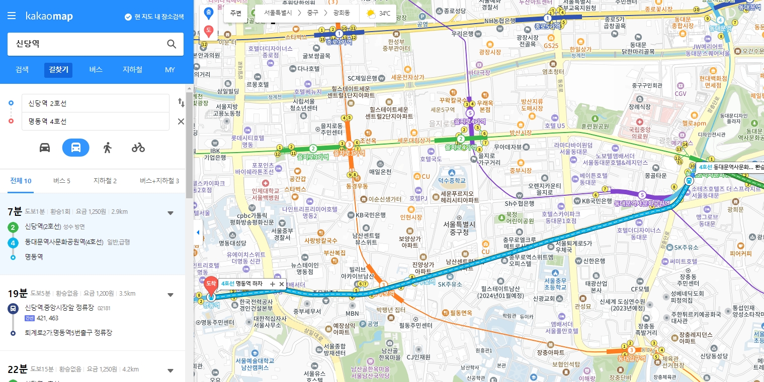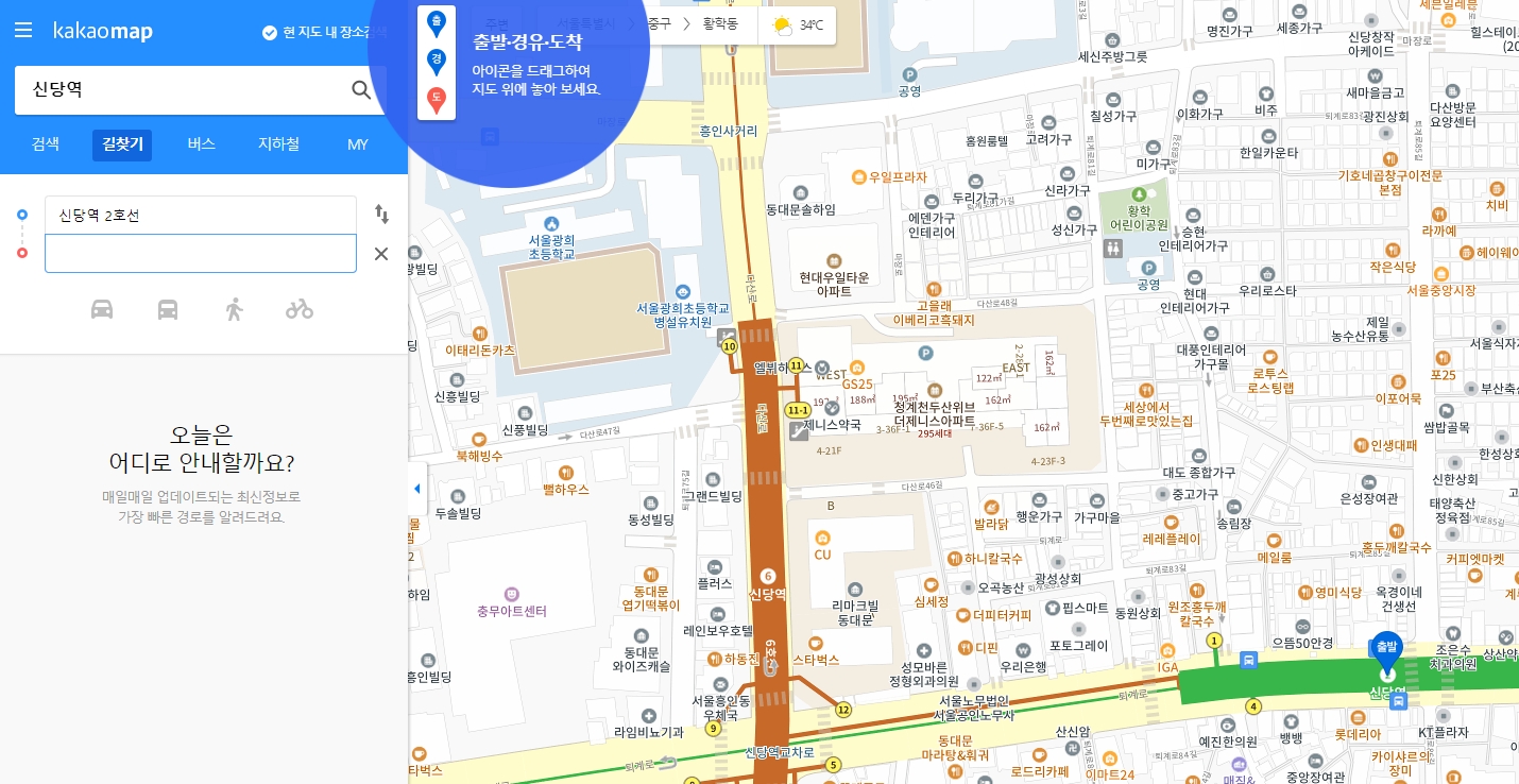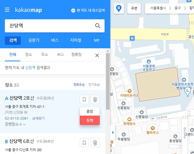 검색했던 위치(예: 신당역)를 출발지 또는 도착지로 설정할 수 있습니다. 설정 후 경로 탐색이 시작됩니다.