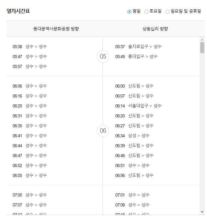 평일, 토요일, 일요일·공휴일 등 날짜에 따라 구분된 시간표가 제공되며, 첫차와 막차 시간도 함께 표시되어 매우 유용합니다.