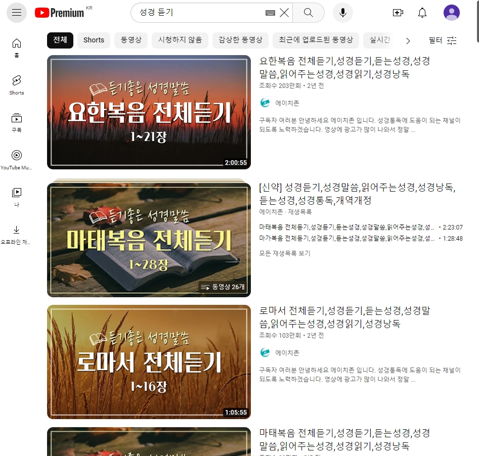검색창에 '성경 듣기'라고 입력하면, 요한복음 전체 듣기, 마태복음 전체 듣기처럼 복음서 전체를 낭독해주는 영상들이 나옵니다. 하루 중 여유 시간에 틀어두기만 해도 은은하게 말씀을 들을 수 있어요.