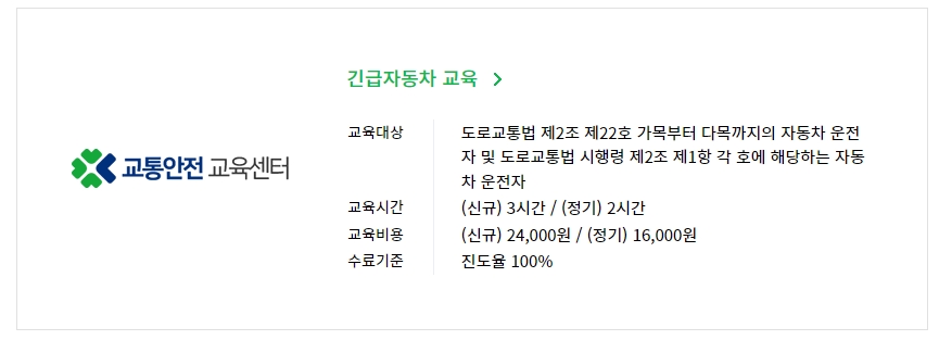 신규 교육은 3시간(24,000원), 정기 교육은 2시간(16,000원)이며, 도로교통법 상 의무 교육입니다. 진도율 100% 충족 시 수료 가능합니다.