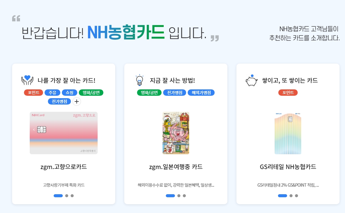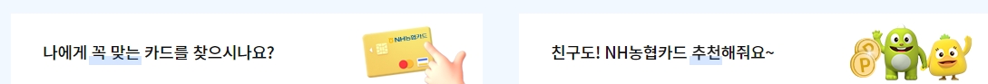 홈페이지 메인에 노출되는 추천 카드는 NH농협카드가 당시 주력으로 판매하고자 하는 상품들입니다. 혜택 구성도 가장 최신인 경우가 많아, 카드 변경 또는 신규 신청 시 꼭 살펴볼 필요가 있습니다.