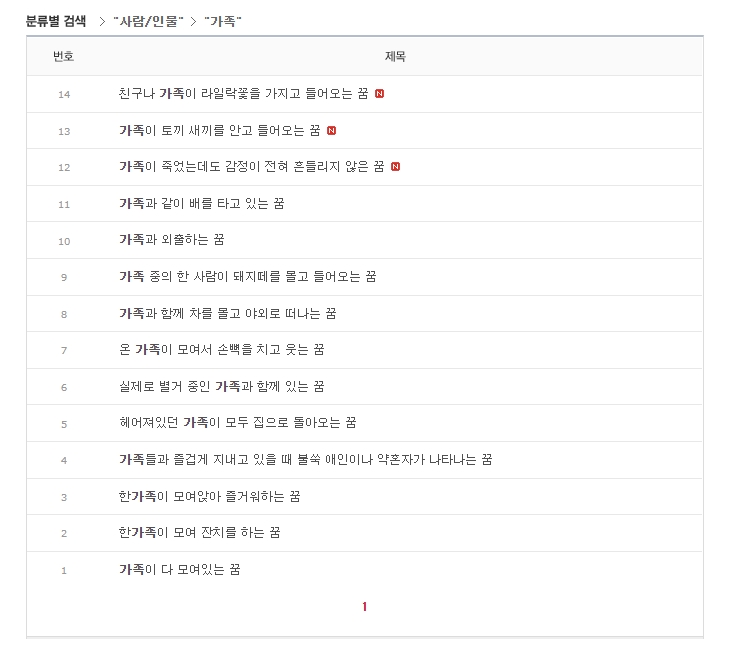 ‘가족’ 카테고리를 선택하면, 가족과 잔치하거나 외출하는 꿈 등 14가지 해몽 결과가 나와요. 상황에 따라 해몽의 뉘앙스가 미묘하게 달라지는 것도 포인트입니다.
