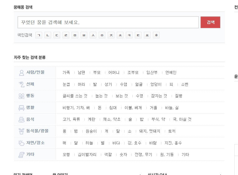 꿈해몽 페이지에서는 직접 키워드를 입력하거나 카테고리별로 탐색할 수 있어요. 원하는 꿈 내용을 보다 쉽게 찾을 수 있습니다.