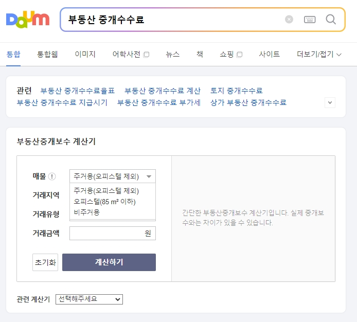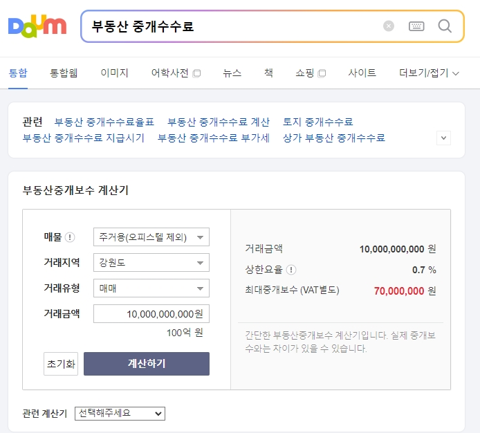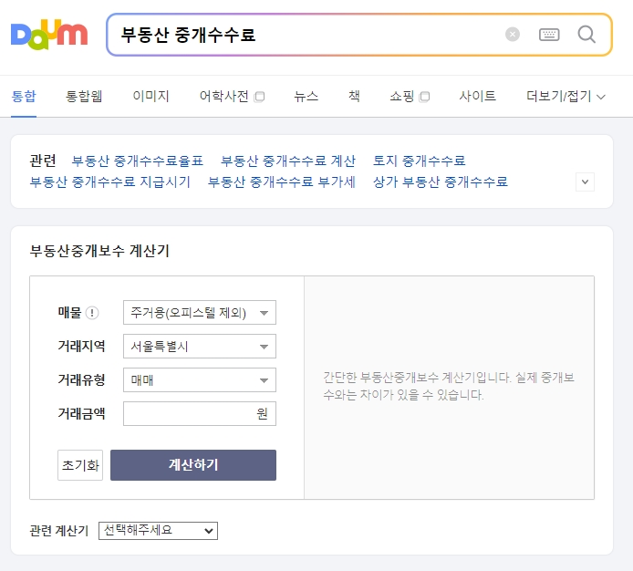 포털 검색창에 ‘부동산 중개수수료 계산기’를 입력하여 다양한 계산기를 통해 확인할 수 있습니다. 거래 유형과 금액, 매물 종류를 입력하면 자동으로 중개수수료가 계산되며, 복잡한 요율 계산 없이 간편하게 결과를 확인할 수 있어 유용합니다.