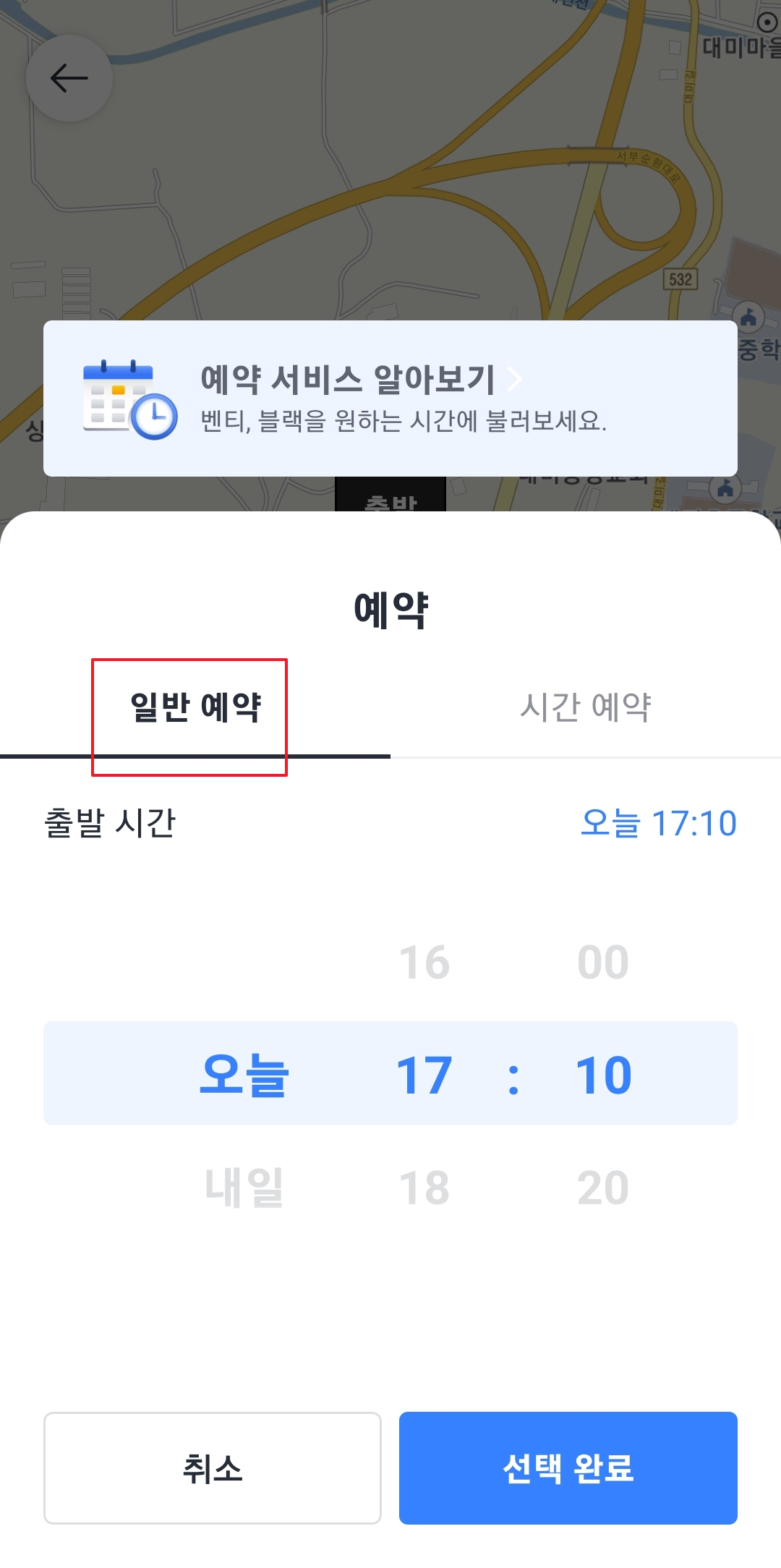 예약 기능에는 일반 예약과 시간 예약이 있습니다. 일반 예약은 즉시 배차가 아닌, 지정 시간에 맞춰 배차를 요청하는 방식이며, 계획된 일정이 있는 경우 유용하게 활용할 수 있습니다.