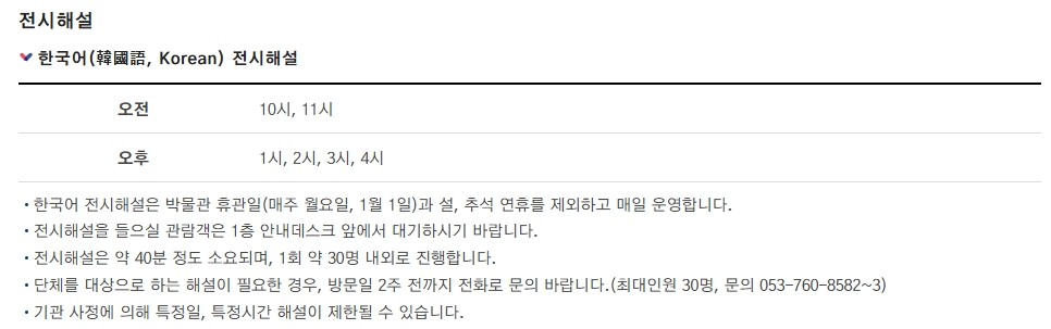 한국어 전시해설은 매일 운영되고 오전 10시, 11시 / 오후 1시부터 4시까지 매 시간 정각마다 진행된다고 되어 있어요. 해설 시간은 40분 정도이며 하루에 최대 4번까지 진행될 수 있습니다.