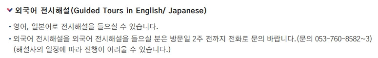 외국인을 위한 전시해설도 따로 제공된다고 나와 있어요. 영어와 일본어로 해설이 가능하다고 안내돼 있고, 이 경우에는 해설사 일정 확인 때문에 최소 2주 전에 전화로 문의를 해야 합니다. 해설이 가능한지 여부는 상황에 따라 달라질 수 있으니, 미리 확인하는 게 좋고 갑자기 찾아가면 못 들을 수도 있다고 생각하시면 됩니다.