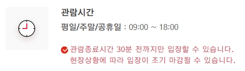 관람시간은 오전 9시부터 오후 6시까지로 정해져 있으며, 요일과 관계없이 평일, 주말, 공휴일 모두 동일한 시간에 운영됩니다. 단, 입장은 관람 종료 30분 전까지만 가능하다고 안내되어 있어서 오후 늦게 가는 분들은 시간 체크를 꼭 하셔야 해요. 그리고 어떤 상황에 따라 입장이 일찍 마감될 수도 있다고 하니 여유 있게 방문하는 게 좋아요.