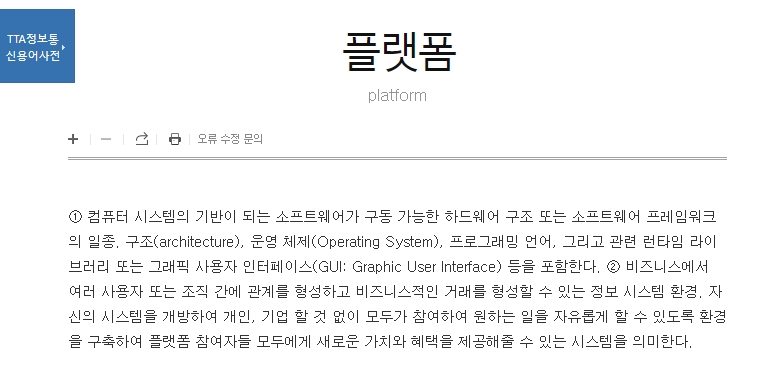 TTA 정보통신용어사전에서는 플랫폼을 참여자 간의 거래가 가능한 개방형 시스템으로 설명합니다. 단순한 기술 구조를 넘어서, 여러 사람이나 조직이 자유롭게 참여하고 새로운 가치를 창출할 수 있는 정보 환경이라는 점에서 중요합니다.