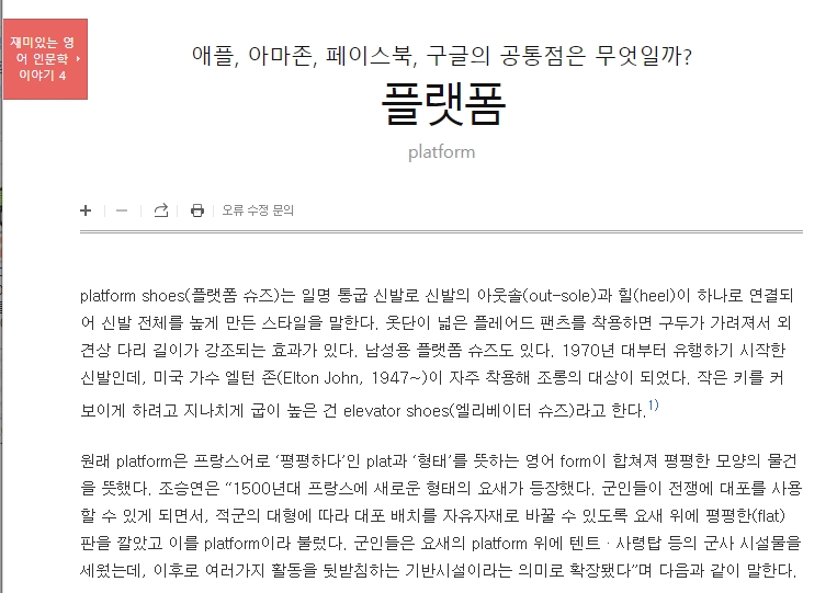 ‘Platform’은 평평한 모양이라는 뜻에서 출발해, 이후 어떤 활동을 지지하는 ‘기반’이라는 뜻으로 발전했습니다. 예를 들어 platform shoes(통굽신발)처럼 외형적인 의미에서도 사용되며, 오늘날엔 소프트웨어나 서비스의 기반으로 의미가 확장되었습니다.