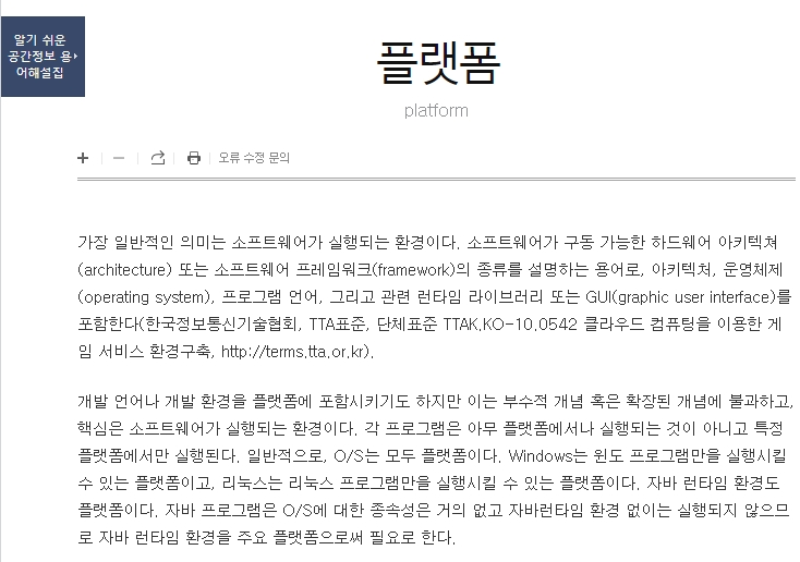 TTA 정보통신용어사전에서는 플랫폼을 참여자 간의 거래가 가능한 개방형 시스템으로 설명합니다. 단순한 기술 구조를 넘어서, 여러 사람이나 조직이 자유롭게 참여하고 새로운 가치를 창출할 수 있는 정보 환경이라는 점에서 중요합니다.