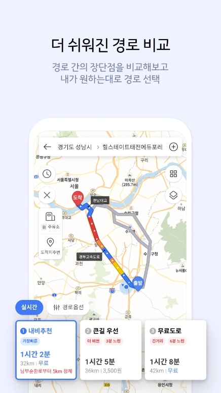 카카오내비는 큰 길 우선, 무료도로 우선, 유료도로 우선, 최단 거리 등 다양한 경로 옵션을 제공합니다. 예를 들어 무료이면서 빠른 경로가 필요하다면 무료도로 우선을 선택해 효율적 이동이 가능합니다.