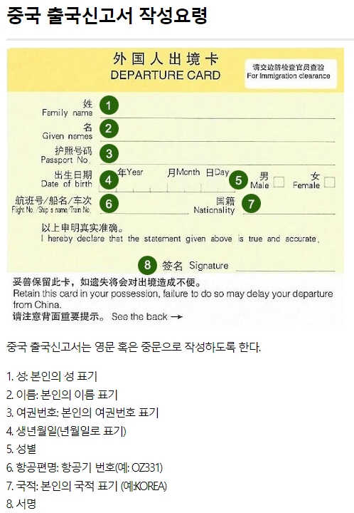 중국을 떠날 때는 출국신고서를 따로 작성해야 할 수 있으며, 이때는 기본 인적사항 외에 출국 관련 정보만 간략히 기재하면 됩니다. 비행기 안에서 배포되거나 공항에서 받게 됩니다.