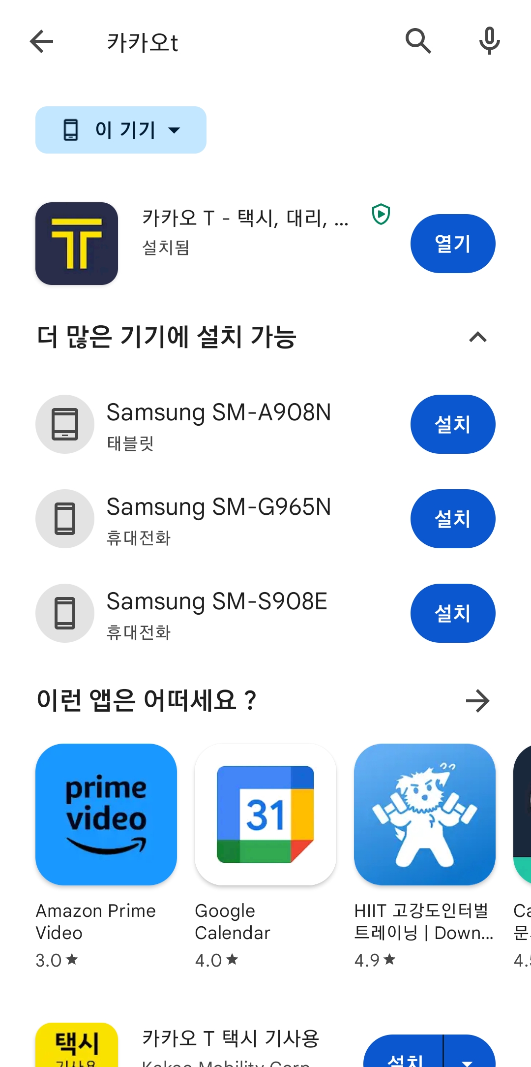 상단 검색창에 '카카오T'를 입력하면 해당 앱이 검색 결과에 표시됩니다. 카카오T는 카카오에서 제공하는 공식 교통 서비스 앱입니다.