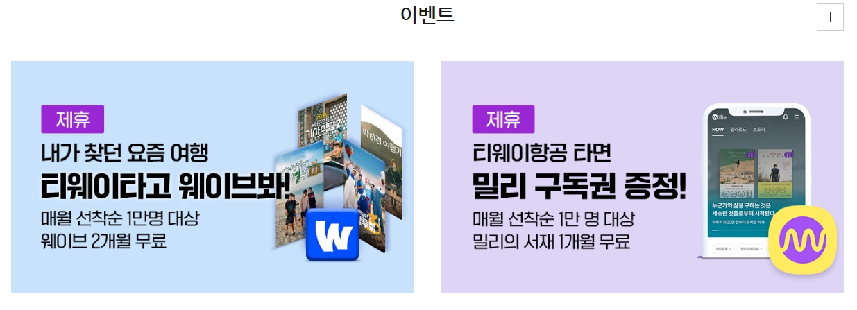 이벤트 탭에서는 ‘항공권 예매 시 매달 1만 명 밀리의 서재 구독권 증정’처럼 시즌별 프로모션을 확인할 수 있습니다. 일부 이벤트는 로그인 회원만 적용되니, 예매 전에 반드시 참여 버튼을 눌러야 혜택이 활성화됩니다.