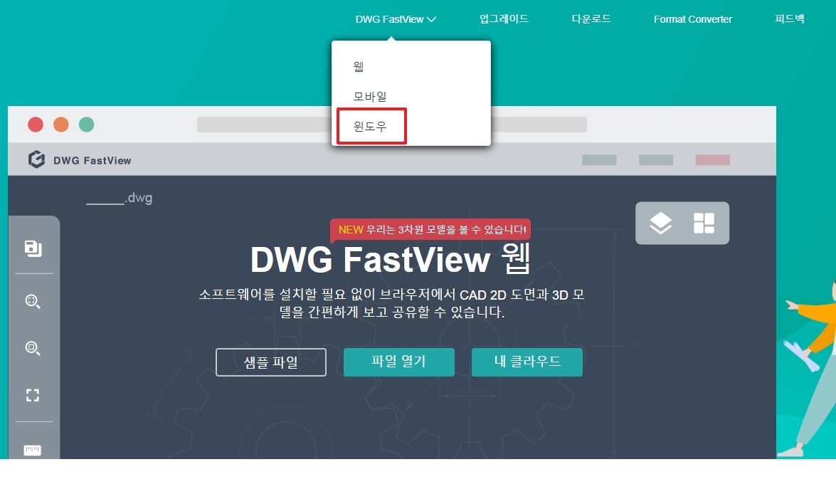 1. DWG FastView를 다운로드하거나 웹에서 바로 이용하기 위해서는 DWG FastView 공식 홈페이지에 접속하셔야 합니다. 홈페이지에 접속하면 상단 메뉴 또는 메인 페이지에서 '파일 열기' 또는 '윈도우 다운로드' 옵션을 찾을 수 있습니다. 웹에서 바로 DWG 파일을 열고 싶다면, '웹버전 시작하기'를 클릭하면 되고, 설치형 프로그램을 원하시면 '윈도우용 다운로드'를 클릭하시면 됩니다.