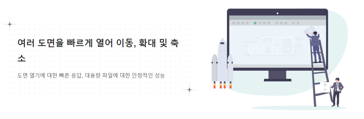 3. 프로그램 설치 후 실행하면 DWG 도면을 빠르고 안정적으로 열람할 수 있습니다. 큰 용량의 DWG 파일도 안정적으로 불러올 수 있으며, 확대/축소, 이동 등의 기능이 부드럽게 작동합니다. 파일 탐색, 레이어 확인, 간단한 치수 측정까지 제공되어, 도면 확인 작업에 매우 유용합니다.