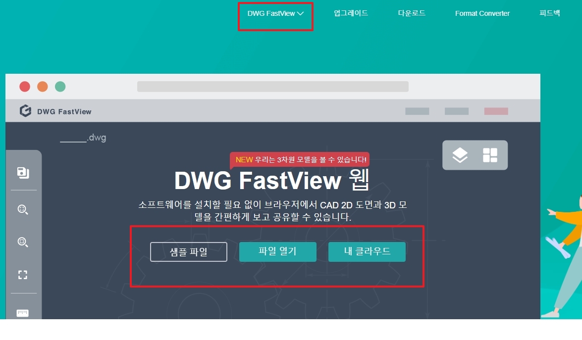 1. DWG FastView를 다운로드하거나 웹에서 바로 이용하기 위해서는 DWG FastView 공식 홈페이지에 접속하셔야 합니다. 홈페이지에 접속하면 상단 메뉴 또는 메인 페이지에서 '파일 열기' 또는 '윈도우 다운로드' 옵션을 찾을 수 있습니다. 웹에서 바로 DWG 파일을 열고 싶다면, '웹버전 시작하기'를 클릭하면 되고, 설치형 프로그램을 원하시면 '윈도우용 다운로드'를 클릭하시면 됩니다.