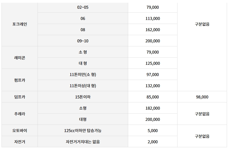 추가 요금 안내 페이지에는 차량의 무게와 크기에 따른 세부 요금이 표로 제공돼요. 예를 들어 포크레인이나 덤프트럭 같은 건설 장비를 선적할 때 얼마나 비용이 추가되는지 확인할 수 있지요. 표에는 승용차뿐 아니라 오토바이, 자전거 같은 작은 이동 수단 요금도 포함돼 있어요. 오토바이는 배에 탑승할 수 있는 배기량 기준(125cc 이하)이 적혀 있어서 주의할 수 있고 자전거는 거치대 미장착 안내가 따로 나와 있어요.