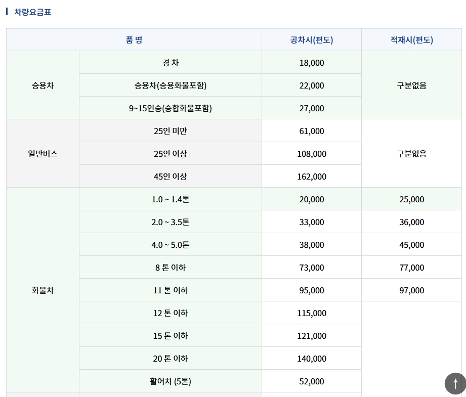 차량 운임 안내 화면에서는 승용차, 화물차, 버스 같은 다양한 차량 운임이 한눈에 정리돼 있어요. 먼저 승용차는 기본으로, 화물차와 버스는 크기와 중량에 따라 요금이 달라지지요. 각 차량별로 공차와 적재 시 요금 차이가 표로 명확히 구분돼 있어서 헷갈리지 않아요. 예를 들어 포크레인이나 덤프트럭 같은 건설 장비도 요금 안내가 있어요.