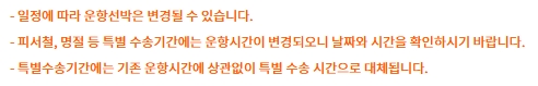 특별 운송 기간에는 일반 시간표 대신 수송 시간표가 적용돼요. 이 기간에는 배가 더 자주 운항되거나 일시적으로 운항 시간이 변경될 수 있지요. 화면에서는 평소 시간표와 비교해서 달라진 운항 시간과 증회 여부를 한눈에 볼 수 있어요. 명절, 피서철 같은 성수기에 해당하는 날짜를 안내해 주니까 실수 없이 여행 계획을 잡을 수 있답니다.
