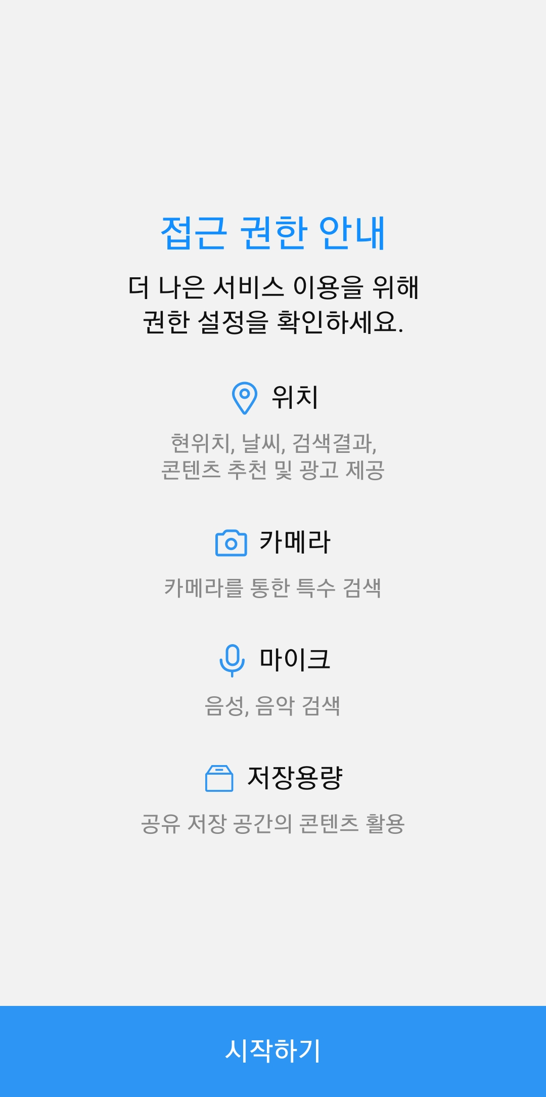 다음 어플을 구글 플레이스토어에서 다운로드한 후 설치하고 시작하기 버튼을 누르면 메인 화면으로 넘어갑니다. 이 화면에서는 꽃 검색 기능을 위한 아이콘과 버튼이 보이며, 앱을 사용할 준비가 완료됩니다.